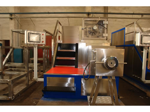 This duplex vacuum plodder is made up of two single-worm plodders. The plodders have separate closed-type transmission systems. The first stage plodder is equivalent to a simplex refiner. It produces soap pellets in its vacuum chamber. The last stage plodder compresses the soap pellets and continuously extrudes them into soap noodles. The noodles come out of the plodder into cutting machine and stamping machine. This duplex vacuum plodder is heavily used in toilet soap manufacture.